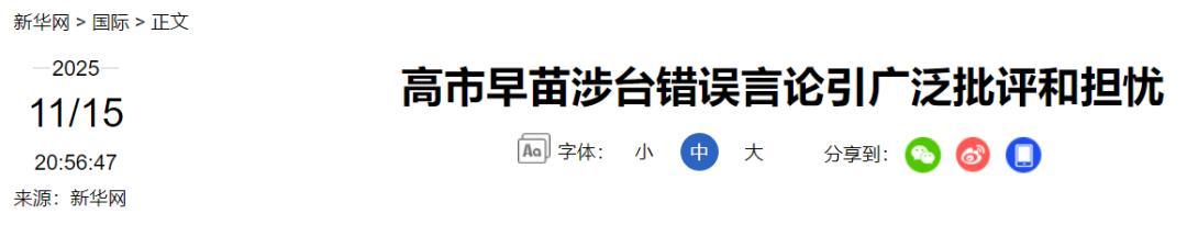 另據新華社11月23日報道,在日本首相高市早苗的社交媒體X賬號下,其近期發佈的帖文引發大量日本網民強烈批評。
