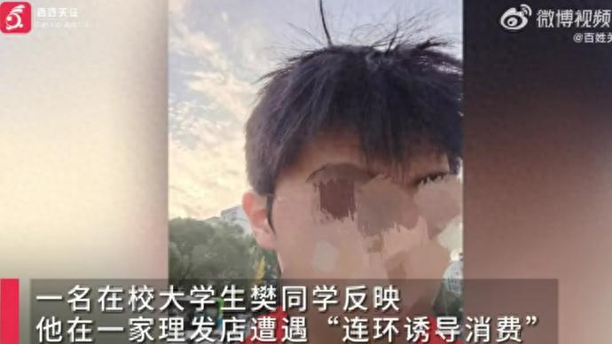 這樣的故事,再次發生在一位大學生身上。有媒體報道,某地在校大學生樊同學反映,他在當地一家理髮店被接連推薦高端項目,頭髮被做成了半成品,最終他被迫消費七個項目,付款一萬元。