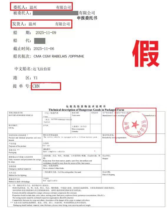 經查,實際託運人爲青島某公司,其委託的貨代在單證製作過程中,冒用了溫州某公司的名稱和印章,製作了包括危險貨物技術說明書、營業執照及申報委託書在內的全套材料。儘管UN3171類貨物根據《國際海運危險貨物規則》可豁免部分包裝要求,但託運人仍須履行如實報告義務。