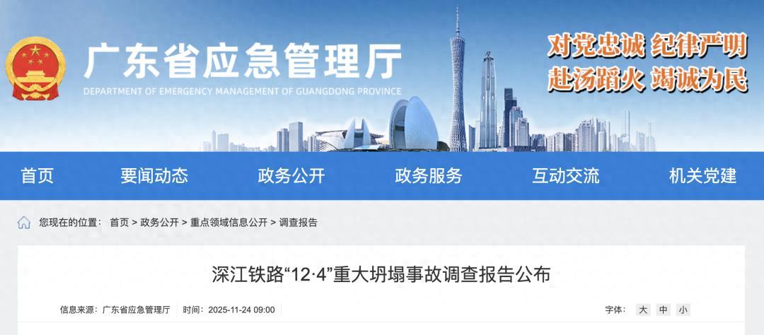 11月 24日,廣東省應急管理廳發佈《深江鐵路“12·4”重大坍塌事故調查報告公佈》。