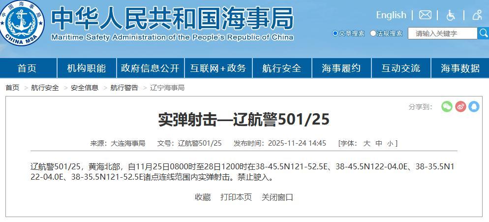 遼航警501/25,黃海北部,自11月25日8時至28日12時在38-45.5N121-52.5E、38-45.5N122-04.0E、38-35.5N122-04.0E、38-35.5N121-52.5E諸點連線範圍內實彈射擊。禁止駛入。