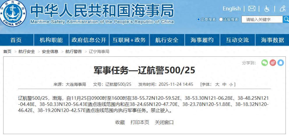 遼航警500/25,渤海,自11月25日9時至16時在38-55.72N120-59.52E、38-53.30N121-06.28E、38-48.25N121-04.48E、38-50.33N120-56.43E諸點連線範圍內和在38-24.65N120-47.70E、38-23.78N120-51.88E、38-18.32N120-46.42E、38-19.20N120-42.57E諸點連線範圍內執行軍事任務。禁止駛入。
