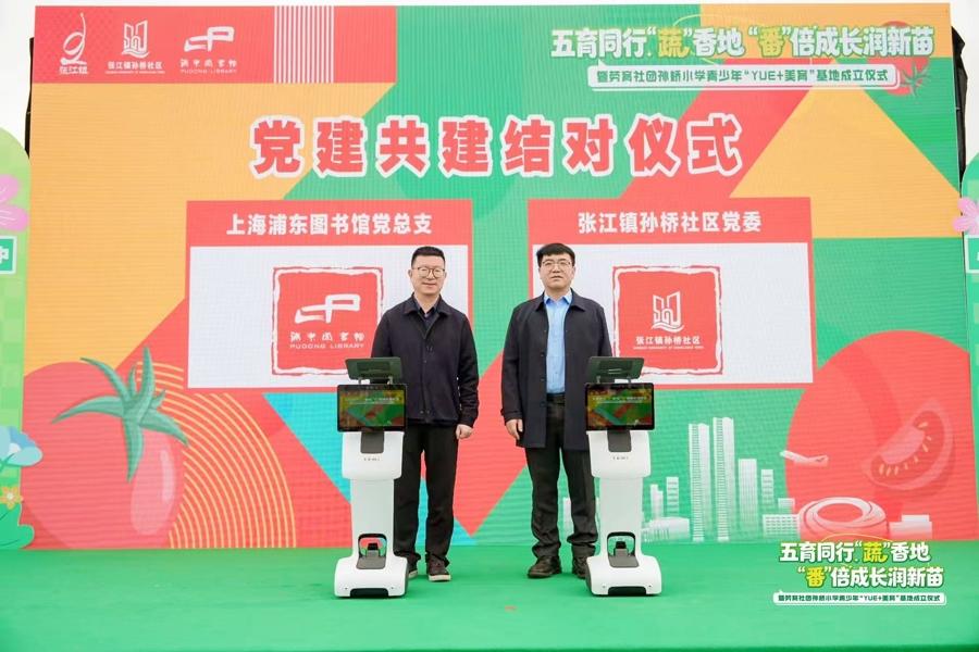 活動現場,浦東圖書館黨總支與孫橋社區黨委進行黨建共建結對簽約,推動優質文化資源與基層社區實踐的深度融合,爲區域教育發展注入強勁的文化動能。同時,浦東圖書館、孫橋社區與孫橋小學攜手共建青少年“YUE+美育”基地,融合閱讀之“閱”、實踐之“躍”、成長之“悅”,構建一個打破校園圍牆,聯通書香與田香的開放式美育實踐場。