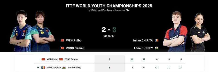 正在羅馬尼亞克盧日-納波卡舉行的2025年國際乒聯世界青少年乒乓球錦標賽再度爆出冷門。在11月25日的U19混雙十六分之一決賽中,中國組合溫瑞博/縱歌曼在先贏兩局的優勢局面下痛失好局,最終以11比9、12比10、4比11、9比11、8比11的比分,遭羅馬尼亞與威爾士的跨國組合尤利安·基裏塔/安娜·赫爾希逆轉,無緣十六強。