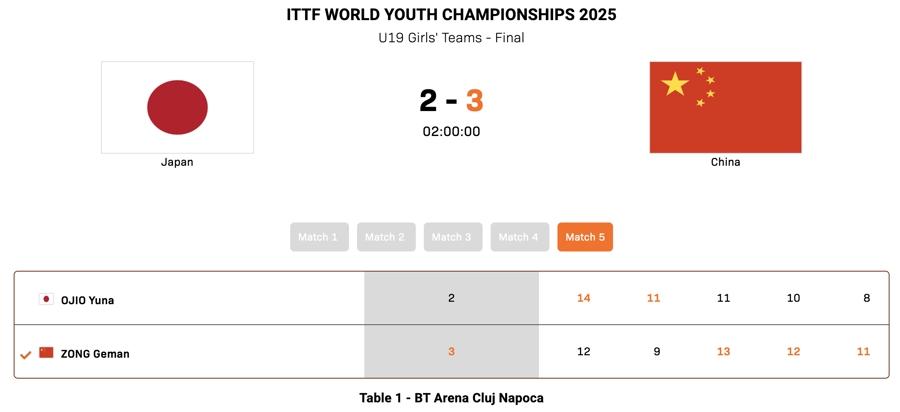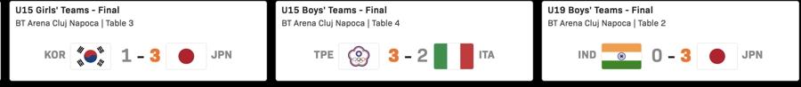 本屆世青賽團體賽場,日本隊已然成爲最大贏家:將女子U15、男子U19兩項冠軍收入囊中,U19女團也榮獲亞軍;而國乒的戰績則顯得格外單薄,僅收穫女子U19冠軍,其餘三項團體賽中,男子U15與女子U15止步四強,男子U19更是止步八強。
