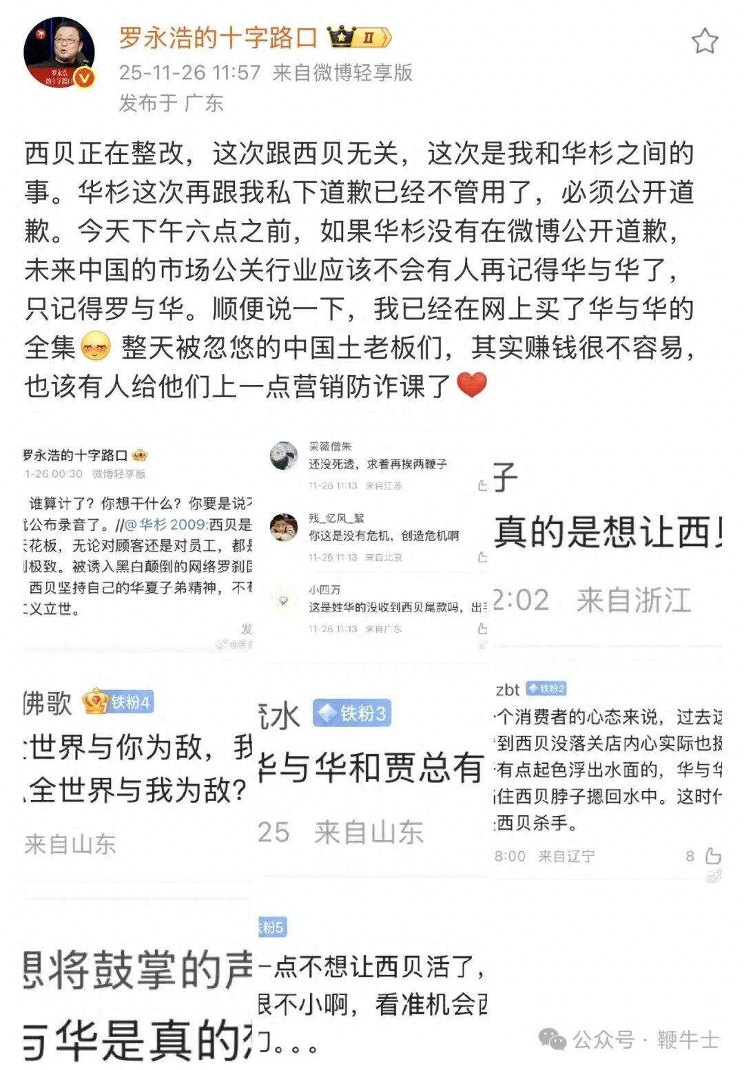 11月26日,羅永浩在微博置頂發言,要求華杉公開道歉。