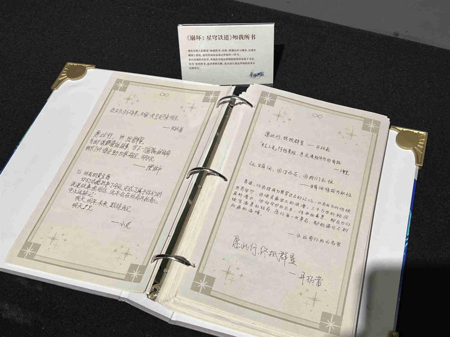 展覽中,“如我所書”留言冊吸引了大量玩家駐足排隊。在不久前落幕的四城巡遊快閃活動中,來自全國各地的玩家曾在這本實體留言冊上,寫下對遊戲角色的寄語——既有簡短真摯的文字,也有精心繪製的塗鴉。活動結束後,該留言冊被正式珍藏於中國音數協遊戲博物館,並於本次特展中首次公開陳列。“這本書記錄的不是官方設定,而是我們每一位玩家對角色、對劇情最真摯的熱愛,”一位玩家感慨道,“它讓我們投入的情感變得可見、可觸,讓這段屬於玩家集體的記憶被鄭重珍藏,意義非凡。”
