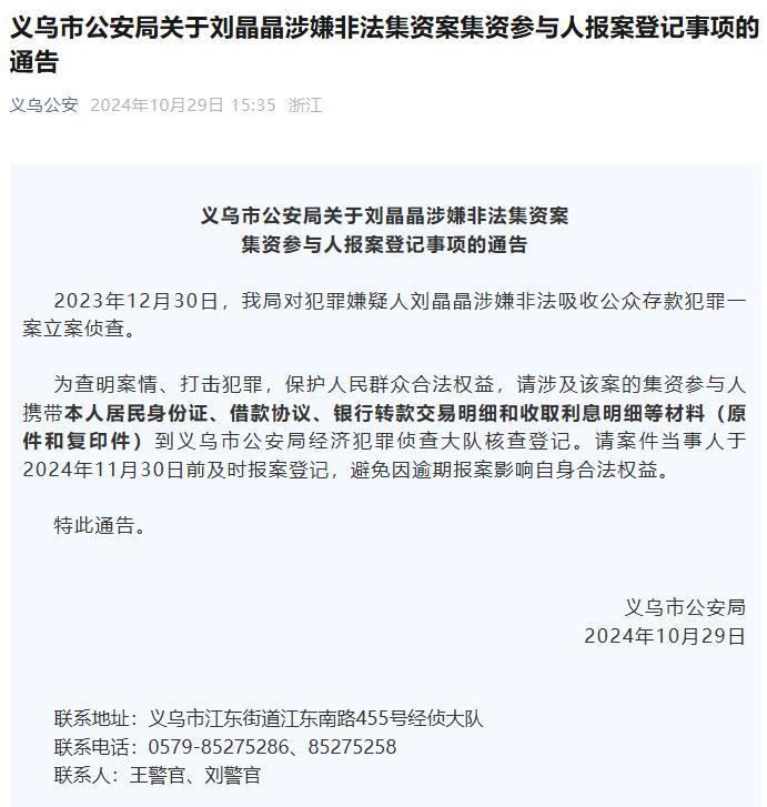 此前義烏公安也有在通告中公佈嫌疑人全名的情況,例如2024年12月30日,其曾發佈“關於劉晶晶涉嫌非法集資案集資參與人報案登記事項的通告”,亦是非法集資案,同樣公佈嫌疑人全名。