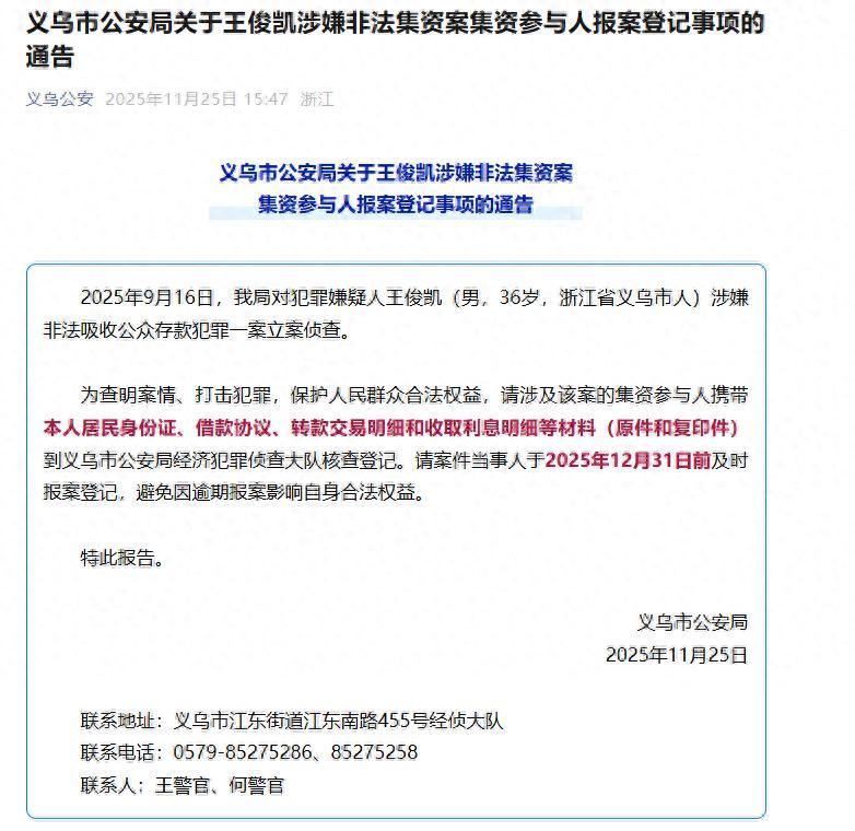 11月25日,義烏市公安局發佈通告:2025年9月16日,我局對犯罪嫌疑人王俊凱(男,36歲,浙江省義烏市人)涉嫌非法吸收公衆存款犯罪一案立案偵查。