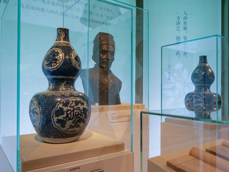 在它的兩旁,是一對上海中醫藥博物館收藏的明代青花葫蘆瓶,其造型源於醫者行醫時保持藥物乾燥所用的葫蘆。《後漢書·費長房傳》記載:“市中有老翁賣藥,懸一壺於肆頭。”世人常稱行醫爲“懸壺”。懸壺濟世,不僅是治病救人的代名詞,也是歷代醫家的至高追求。本次展出的葫蘆瓶的瓶腰有“福”“壽”“康”“寧”四字,開光部分則裝飾獅子滾繡球等吉祥圖案,表達美好寓意。