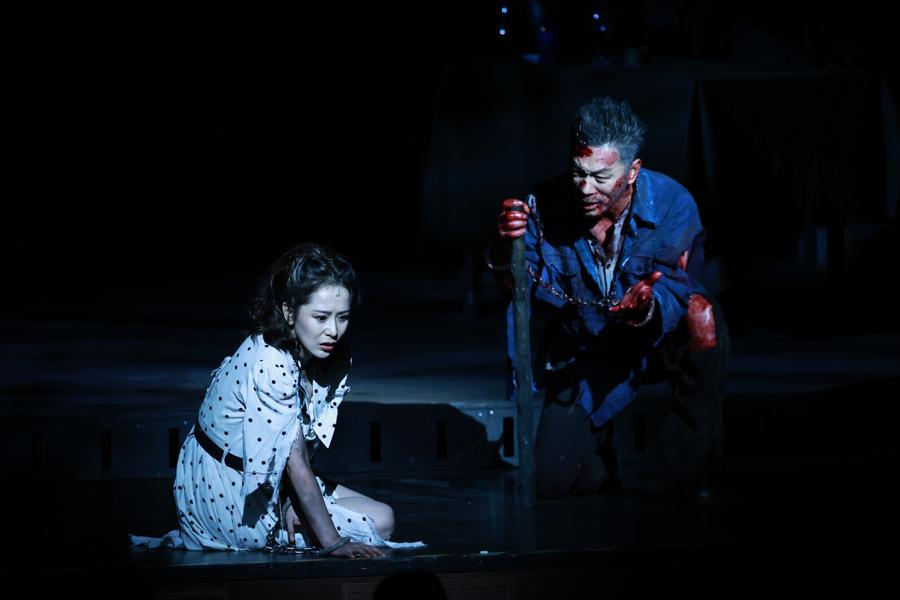 國話的這版《死無葬身之地》有個極具衝擊力的設計:轉場間隙、劇場黑燈時,總有一臺射燈投向觀衆席,甚至從一個個觀衆臉上掃過,讓觀衆也如同劇中被俘的游擊隊員那樣,感受到如同監獄探照燈般的巡視和監控。於觀者,沉浸感、對話感極強;於演員,與臺下“同行者”身在同一場域,近到可以同呼吸。
