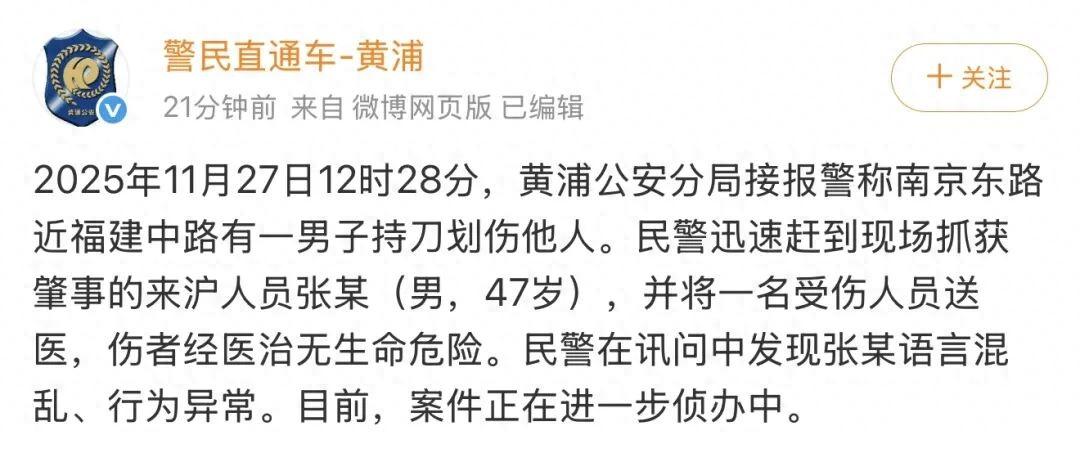 2025年11月27日12時28分,黃浦公安分局接報警稱南京東路近福建中路有一男子持刀劃傷他人。民警迅速趕到現場抓獲肇事的來滬人員張某(男,47歲),並將一名受傷人員送醫,傷者經醫治無生命危險。民警在訊問中發現張某語言混亂、行爲異常。目前,案件正在進一步偵辦中。
