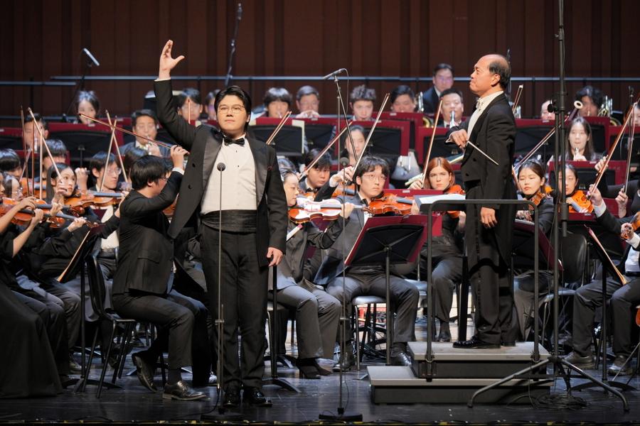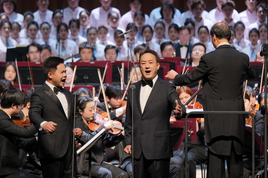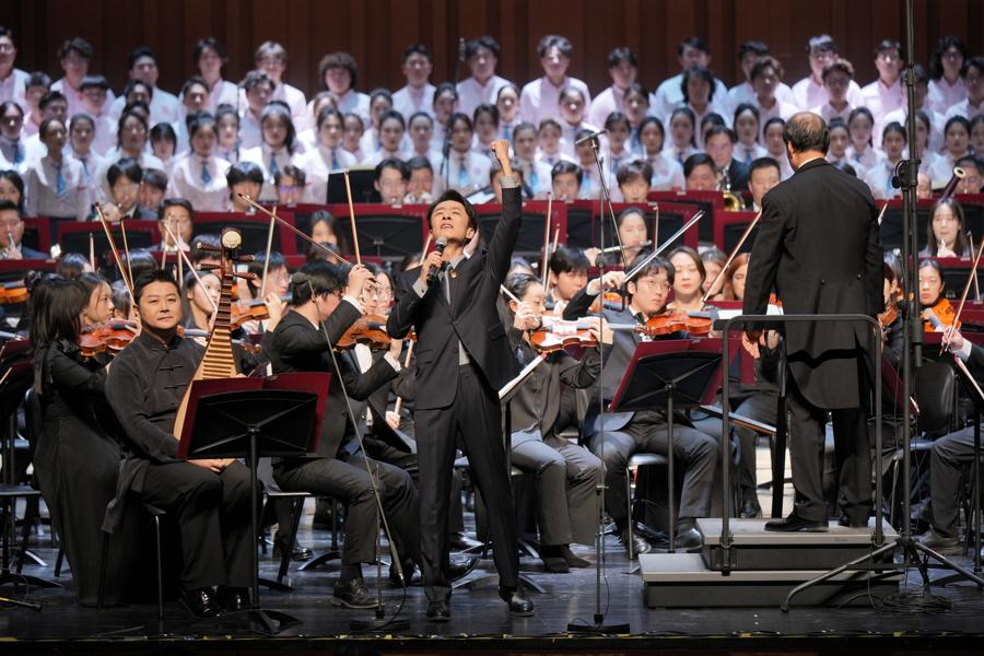 兩位金鐘獎得主的表現同樣亮眼。男中音張曦剛拿下第15屆中國音樂金鐘獎美聲組獎項,在音樂會上下半場分別獻上比才《卡門》中激昂澎湃的《鬥牛士之歌》與《黃河頌》。“學校的教創演研一體化培養模式,讓我在專業技能、作品詮釋和綜合素養上實現了全方面進步。”他感慨道:“從第一次登臺演唱,到如今在母校校慶音樂會唱響經典,導師們的全程陪伴讓我少走了很多彎路,《黃河頌》裏的家國情懷,也讓我更懂音樂人的使命。”
