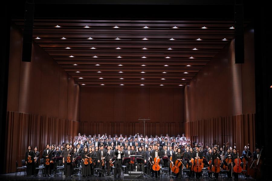 演出由張國勇教授執棒上音交響樂團與交響管樂團,鄒栩翔老師指揮上音合唱團和“果韻同聲”合唱團。從《黃河船伕曲》到《怒吼吧,黃河》,音樂在張國勇的指揮下層層推進,氣勢磅礴。上音交響樂團與交響管樂團的演繹富有朝氣與活力,進一步豐富了作品的音響層次;朗誦者楊楊的深情道白,與聲歌系教授趙勇、青年教授陳家坡和張曦、顧文夢的精彩領唱相得益彰,共同構建起一幅壯闊的歷史音畫。
