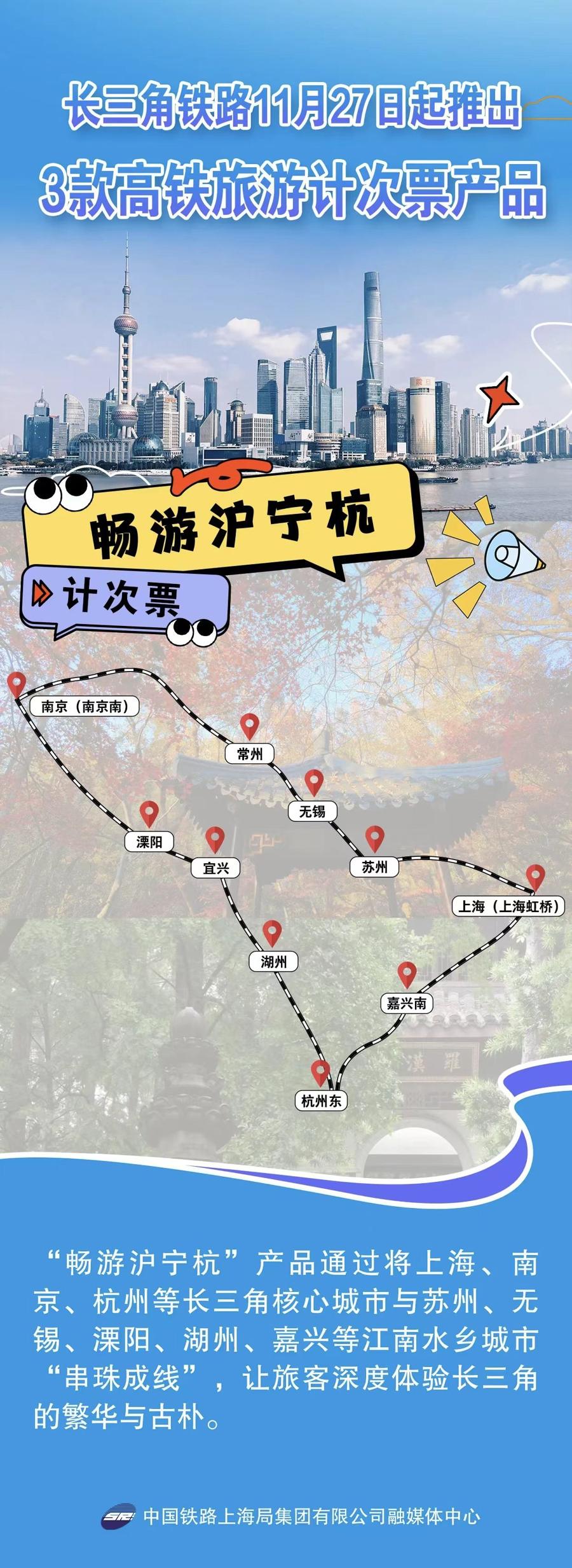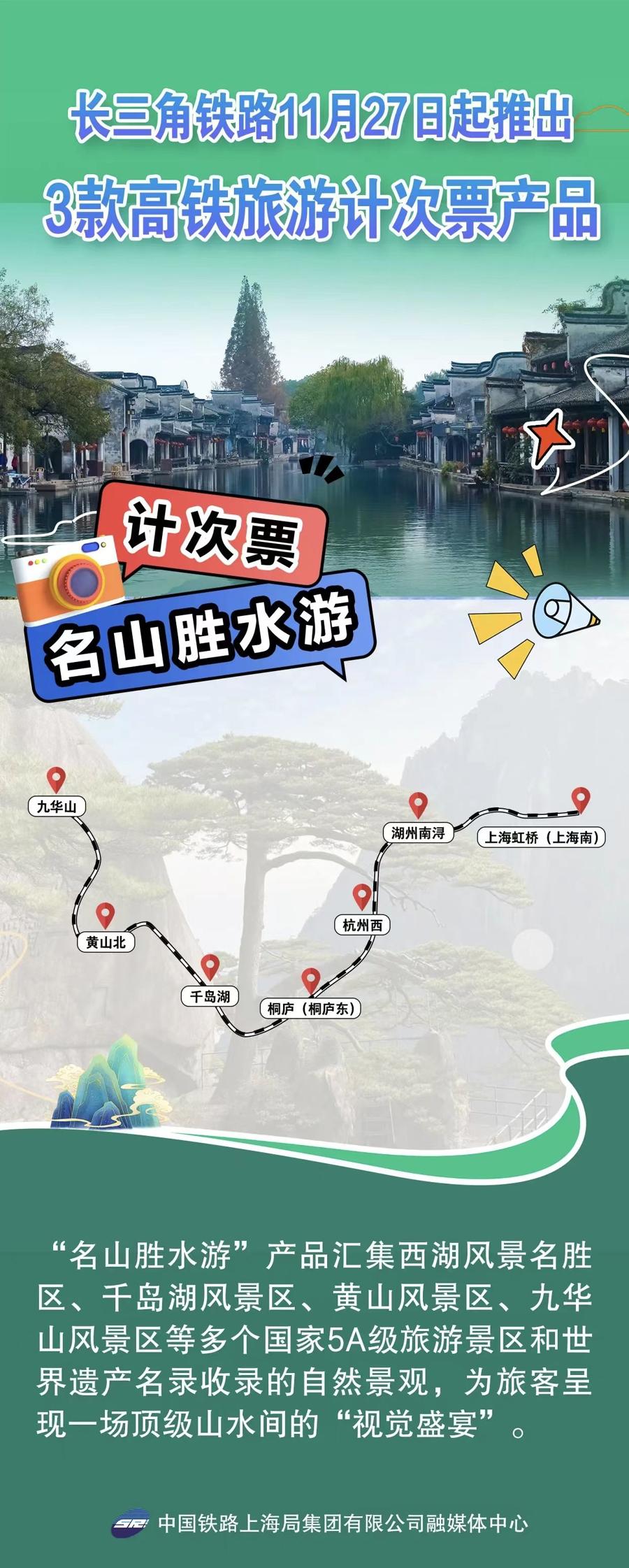 “暢遊滬寧杭”“名山勝水遊”“水鄉畫卷遊”……昨起,長三角鐵路推出3款旅遊計次票產品,爲旅客“量身”打造15日暢遊長三角的乘車新體驗,涉及寧杭高鐵、滬蘇湖高鐵、杭溫高鐵、杭黃高鐵、滬寧城際等5條高鐵線路的26座車站。