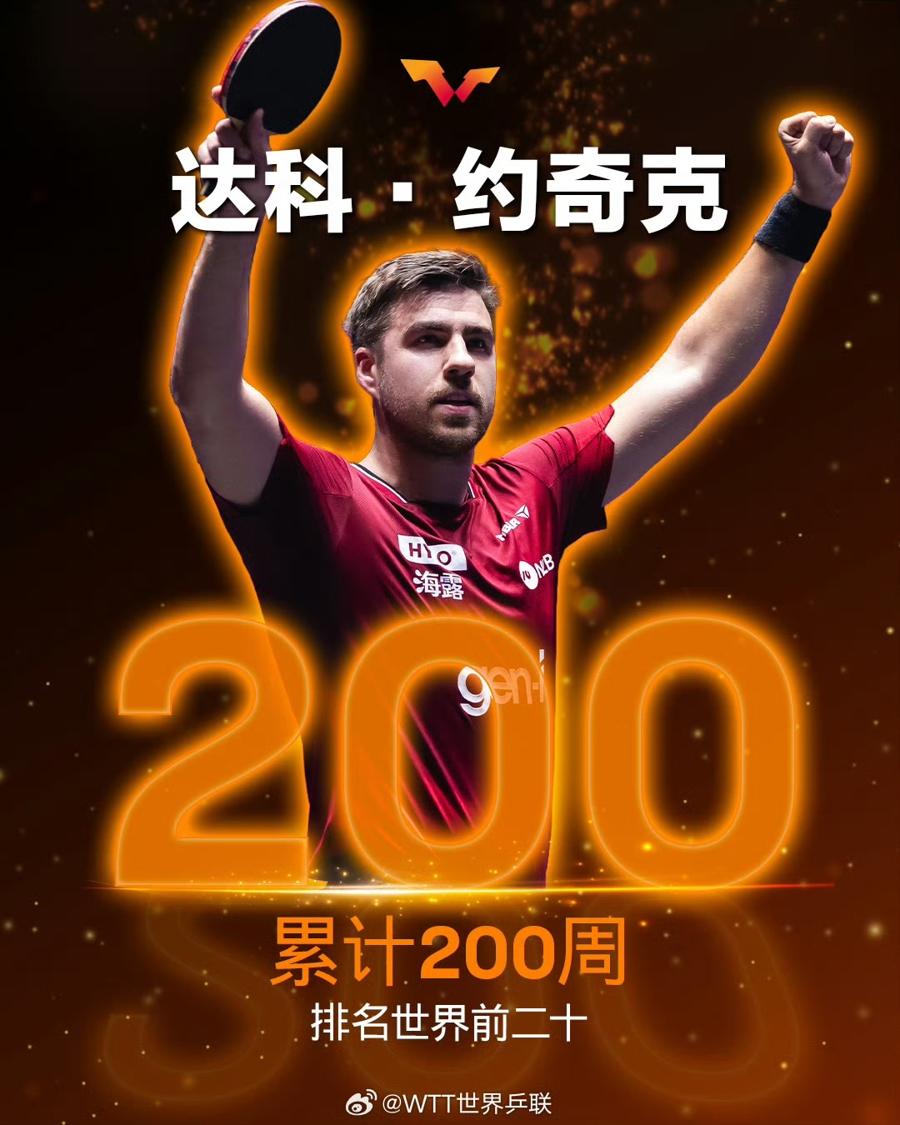 斯洛文尼亞名將達科·約爾吉奇成爲另一位紀錄創造者,他的男單世界前二十累計週數突破200周。作爲國際賽場最具實力的歐洲選手之一,目前世界排名第14位的約爾吉奇本賽季展現出不俗的競技狀態:先後闖入WTT斯科普里挑戰賽和WTT盧布爾雅那球星挑戰賽四強。此外,他還在WTT美國大滿貫、WTT歐洲大滿貫躋身八強,並在WTT阿拉木圖挑戰賽、WTT蒙彼利埃冠軍賽、WTT馬斯喀特球星挑戰賽同樣闖入四分之一決賽階段。