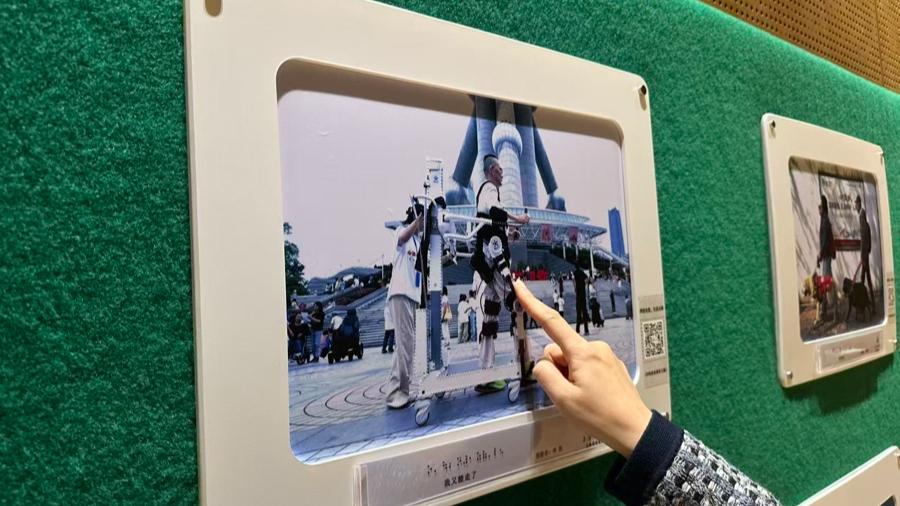 沿着畫面中“外骨骼”的輪廓,一圈凸起的小白點讓整幅攝影作品看起來不同尋常——這個特別的設計,是讓視障朋友在欣賞作品時可以配合一旁的盲文圖說,更清晰地感知整幅作品訴說的內容。在今天開啓的“江潮同映 鏡界共生”2025年首屆長三角“三省一市”殘健融合攝影展巡展上,29件優秀作品藉助盲文凸點印刷技術,加載了“無障礙瀏覽”功能。在上海圖書館東館的無障礙閱覽室時裏,不少參觀者觸摸着畫面上突起的圓點、線條,從另一個角度感受着作品帶來的力量。據悉,這些特製作品將在此長期展出。