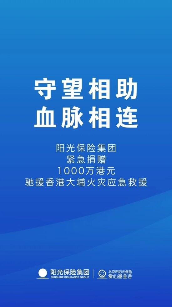 陽光保險集團捐贈1000萬港元,緊急馳援香港大埔火災救援