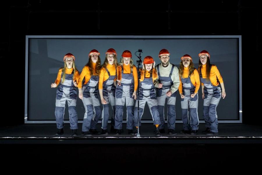 《我的故鄉》的劇作文本是根納主觀視角的獨白,臺上的表演者是複數的,由男主角和一羣女演員組成。根納面對觀衆陳述時,麥克風上綁着即時攝像設備,他的表演特寫會投影在舞臺後方的銀幕上,這個手法很明顯學習了近20年邵賓納劇院和柏林人民劇院的常用思路。女演員的羣戲以歌唱和舞蹈穿插在根納的獨白中,合唱既有根納內心的祕密,也有對根納行爲的評述,這其實類似古希臘戲劇中的歌隊;羣舞編排是對歌隊的視覺補充,既有梅耶荷德理論的活學活用,又靈巧借鑑當代歐洲的肢體劇場。整場表演讓人看到這羣青年演員眼界開闊且有方向感,並沒有讓不同時代、不同背景的創作方法在同一個舞臺上現出拼接感,而是形成了“我們的表達”。學習“傳統的”“世界的”“他人的”資源,化用成“我們的”,這不僅不自卑,更是自信的創作審美了。