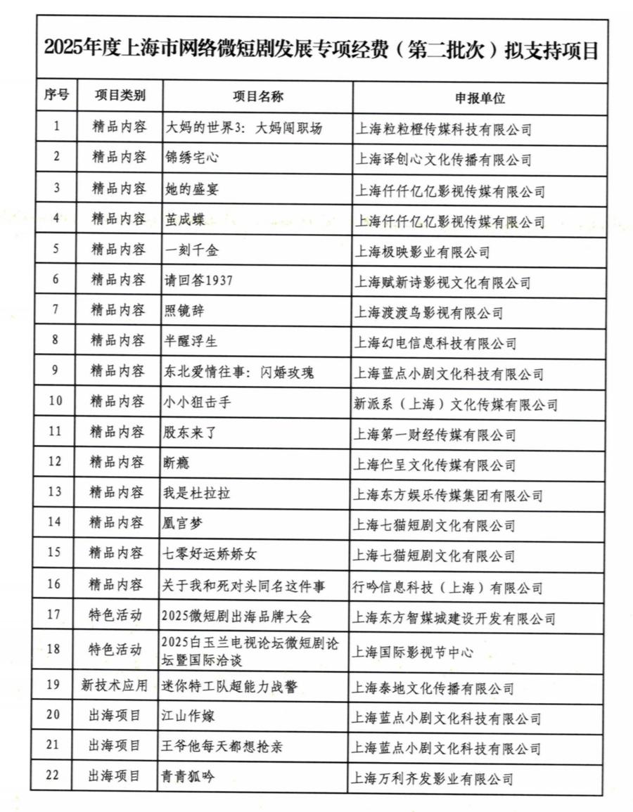 日前,上海市文化和旅遊局發佈公示,公佈2025年度上海市網絡微短劇發展專項經費(第二批次)擬支持項目名單,公示期爲2025年11月28日至12月4日。