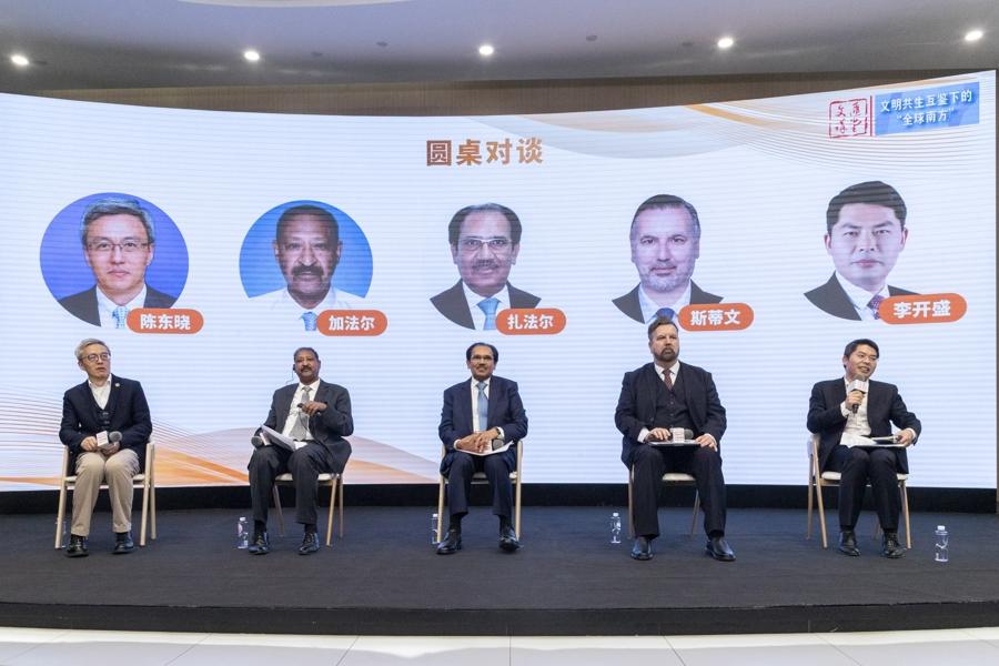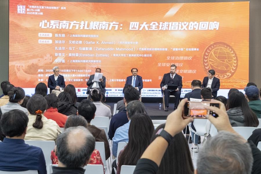 【導讀】10月12日,文匯講堂全球南方系列十講之收官《心繫南方紮根南方:四大全球倡議的迴響》在上報集團成功舉辦。上海國際問題研究院院長陳東曉主講,與蘇丹前駐華大使加法爾·艾哈邁德(Gafar K. Ahmed)、巴基斯坦前總理特別助理兼該國“讀懂中國”論壇理事長扎法爾・馬赫默德(Zafaruddin Mahmood)、常州大學拉丁美洲研究中心副主任兼墨西哥維拉克魯斯大學在華代表斯蒂文·索特雷(Esteban Zottele)、上海國際問題研究院副院長李開盛展開圓桌對話。結束後舉辦了簡短的閉幕式,復旦大學一帶一路與全球治理研究院常務副院長黃仁偉代表學者宣讀了十大核心觀點。2.3萬餘人通過六個直播平臺觀看直播。