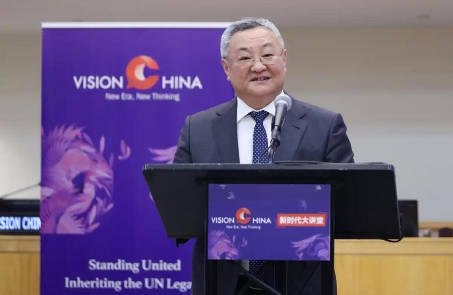 當地時間9月15日,紐約聯合國總部的“新時代大講堂”探討全球治理倡議。圖爲中國常駐聯合國代表、特命全權大使傅聰致辭。聯合國副祕書長李軍華,聯合國南南合作辦公室主任迪瑪·哈提卜,哥倫比亞大學可持續發展中心主任、教授傑弗裏·薩克斯,新加坡學者馬凱碩,美國飛虎隊創始人陳納德將軍外孫女、陳納德飛行學院院長嘉蘭惠,摩洛哥、尼加拉瓜、巴基斯坦、卡塔爾、俄羅斯常駐聯合國代表團外交官作分享交流。圖源中國日報社