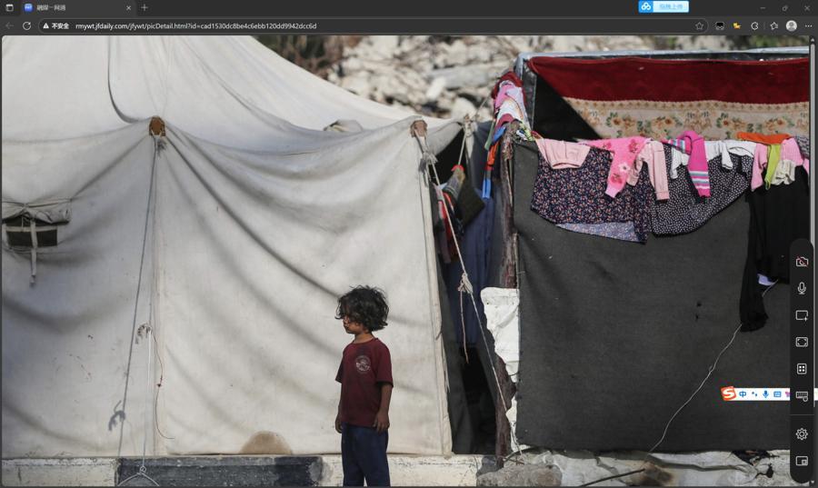 10月5日,在加沙地帶中部,一名兒童站在難民營的帳篷前。聯合國兒童基金會發言人裏卡多·皮雷斯7日表示,新一輪巴以衝突爆發兩年來,已導致加沙地帶約6.1萬名兒童死亡或殘疾。圖源新華社