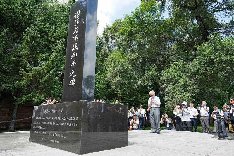 2024年8月13日,侵華日軍第七三一部隊“少年隊”原隊員清水英男在侵華日軍第七三一部隊舊址“謝罪與不戰和平之碑”前懺悔謝罪。新華社發