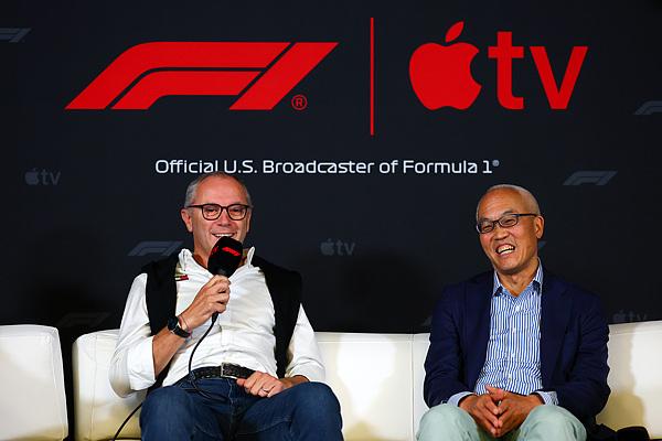 今年美國大獎賽,F1集團首席執行官多梅尼卡利和自由媒體公司總裁兼首席執行官德里克·張出席蘋果電視新聞發佈會