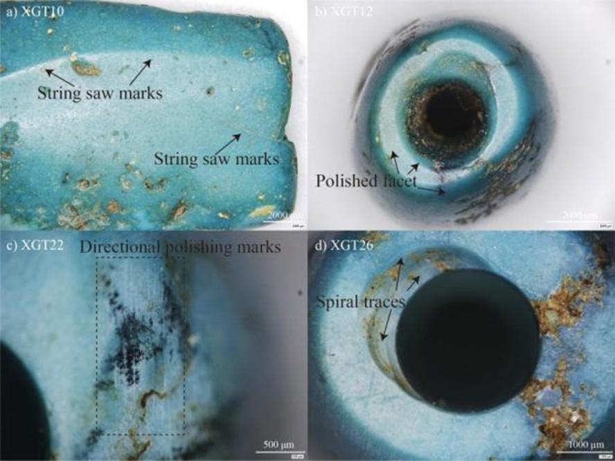 此外,研究人員還應用便攜式X射線熒光光譜、傅里葉變換紅外光譜與光纖反射光譜等非破壞性技術,快速獲取綠松石樣品的成分與顏色信息,並結合光學顯微鏡與掃描電鏡對樣品表面特徵和加工痕跡進行觀察,“比如我們能在樣品內壁看到鑽具高速形成的細密螺紋,內壁較直,孔徑略大於孔心。”楊菊指着一張綠松石樣品高清掃描圖片說,“這些複雜工藝痕跡說明古人已掌握較高水平的珠飾製作技術。”