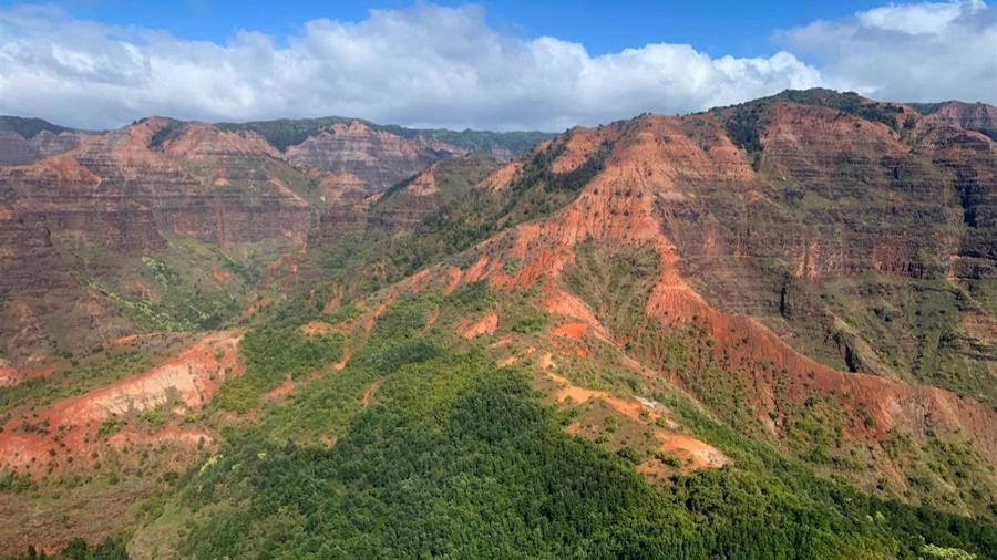 考愛島的大部分地區無法徒步抵達,島上隱藏的宏偉景觀包括銅紅色峽谷、堡壘般的海崖和衆多高聳的瀑布……好在當地有直升機公司提供空中觀光,讓我得幸在臨行時鳥瞰考愛島隱藏的原始自然風光。飛行員卡姆是第三代德裔,他一隻手指着艙門外的山脊:注意左前方山脊的白色痕跡——那是山羊踏出來的路,比島上所有公路的歷史都要久。