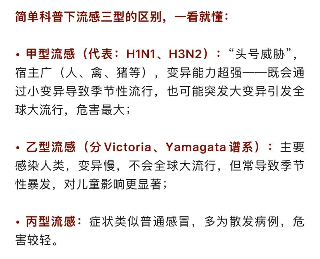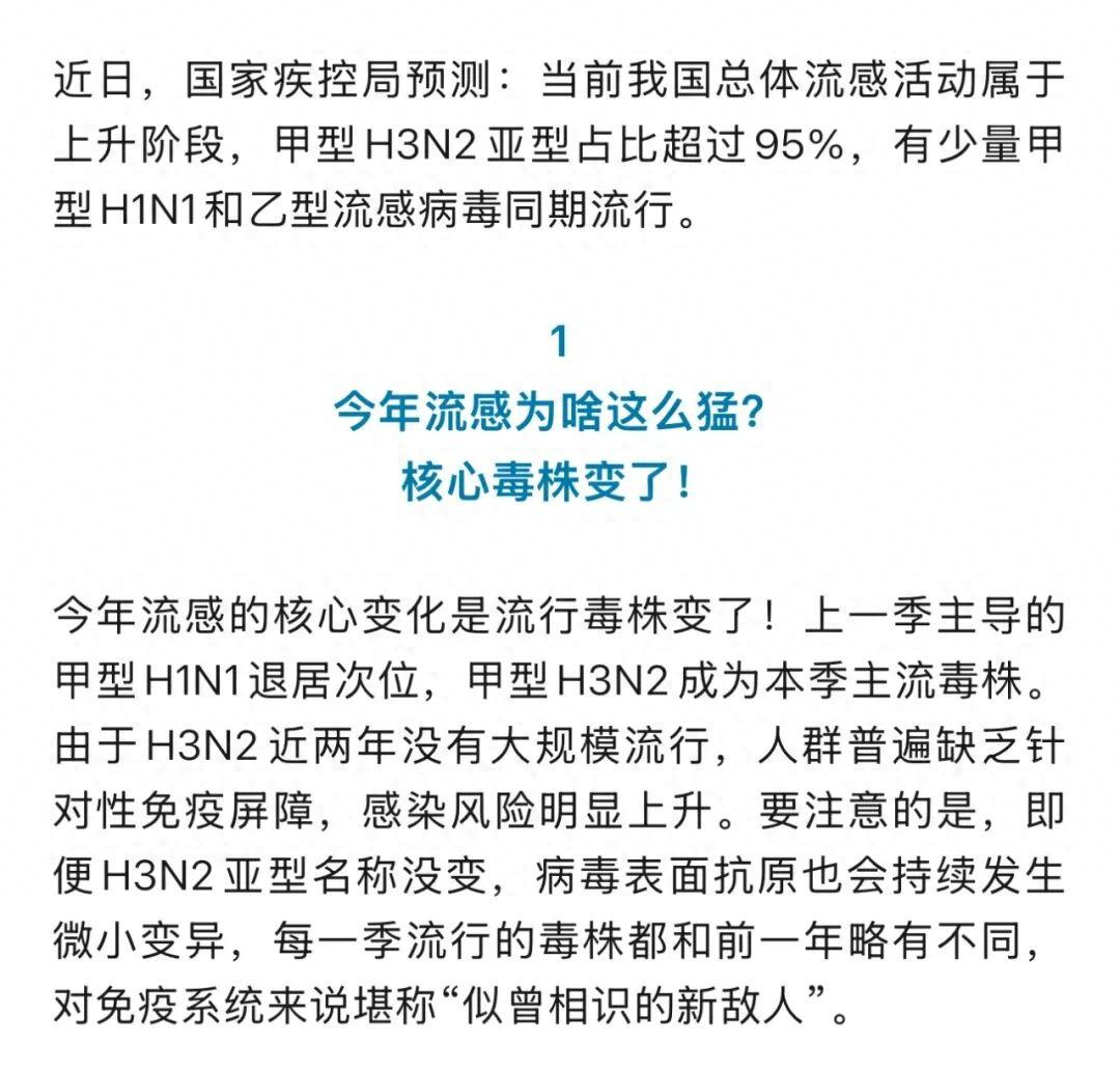 流感的臨牀症狀:本次流行的H3N2毒株引起的症狀可能包括持續高熱(39-40℃)、劇烈頭痛、全身肌肉痠痛和乏力。部分患者可能出現嘔吐、腹瀉等胃腸道反應,有的會出現肺炎、心肌炎等嚴重併發症。
