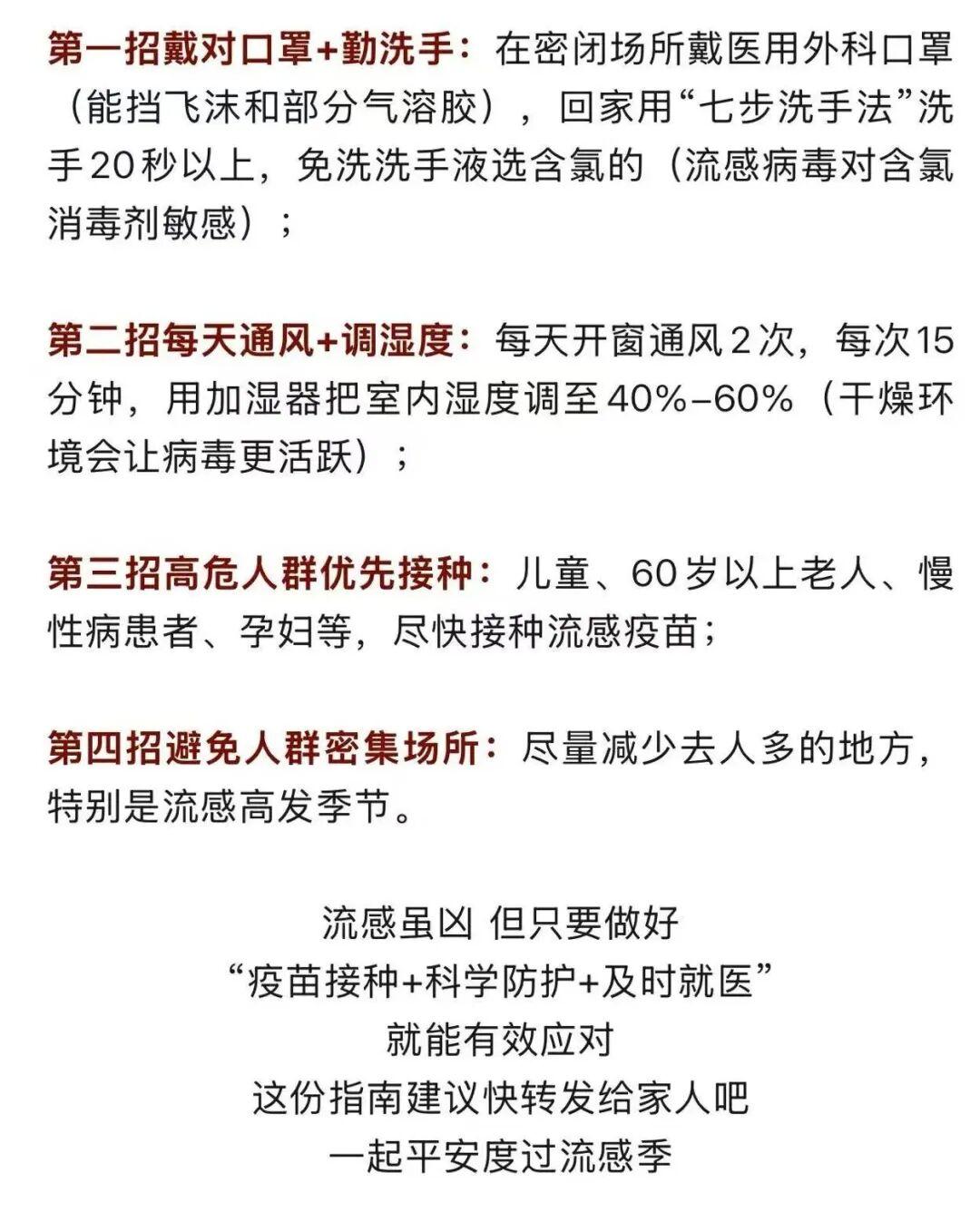 最有效的手段是每年接種流感疫苗,建立免疫屏障;在流行季要佩戴口罩、勤洗手;一旦出現症狀,應儘早就醫並在黃金48小時內啓動抗病毒(如奧司他韋、瑪巴洛沙韋等)能有效減輕症狀、減少併發症。務必遵醫囑,切勿自行用藥。