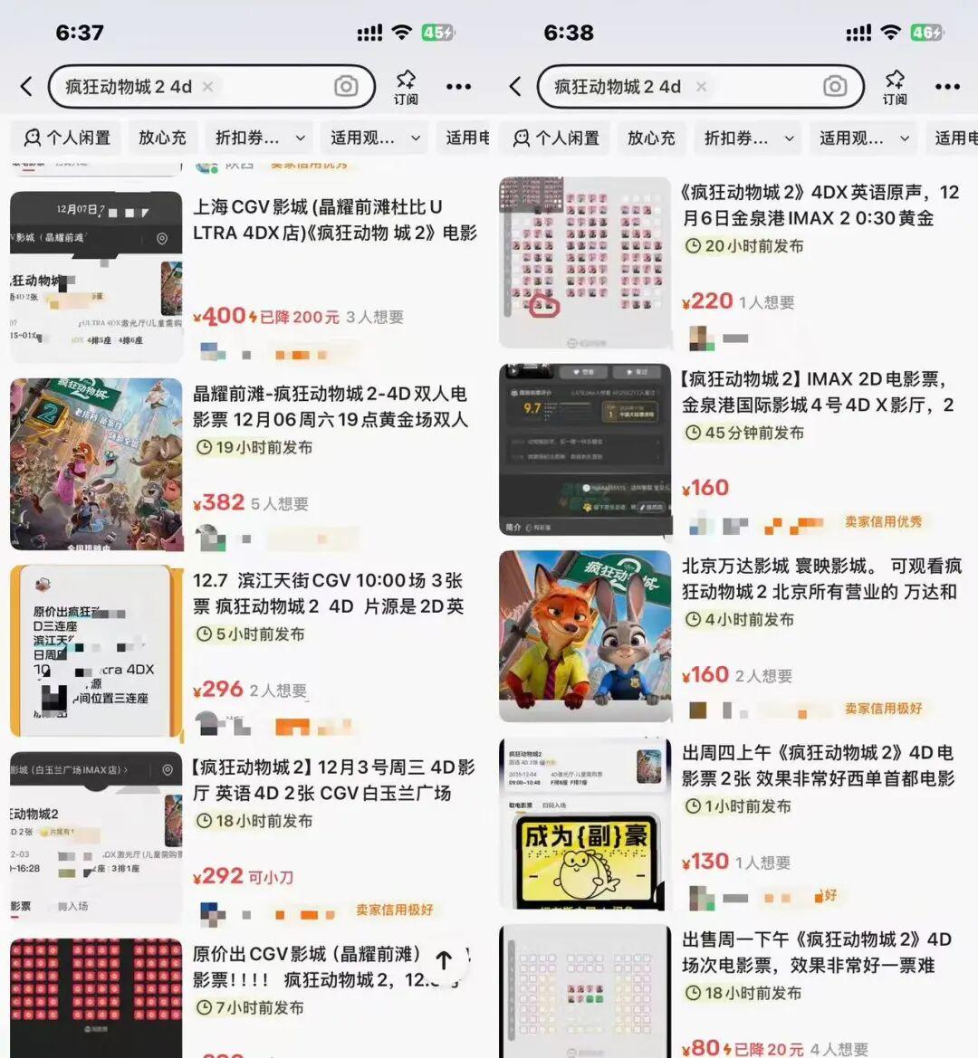 在社交平臺的帖子中,甚至有影迷在“重金求票”。記者查詢發現4D版《瘋狂動物城2》的票價爲40元至160不等。