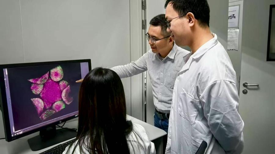 楊衛兵研究員(中)和論文主要作者朱先苗(右)、陳興(左)觀察植物幹細胞
