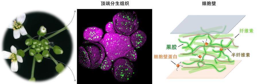 細胞壁與植物幹細胞命運決定。左圖顯示擬南芥花序和莖頂端分生組織。洋紅色標記細胞壁,綠色指示正在分裂的幹細胞。右圖爲植物初生細胞壁結構示意圖。