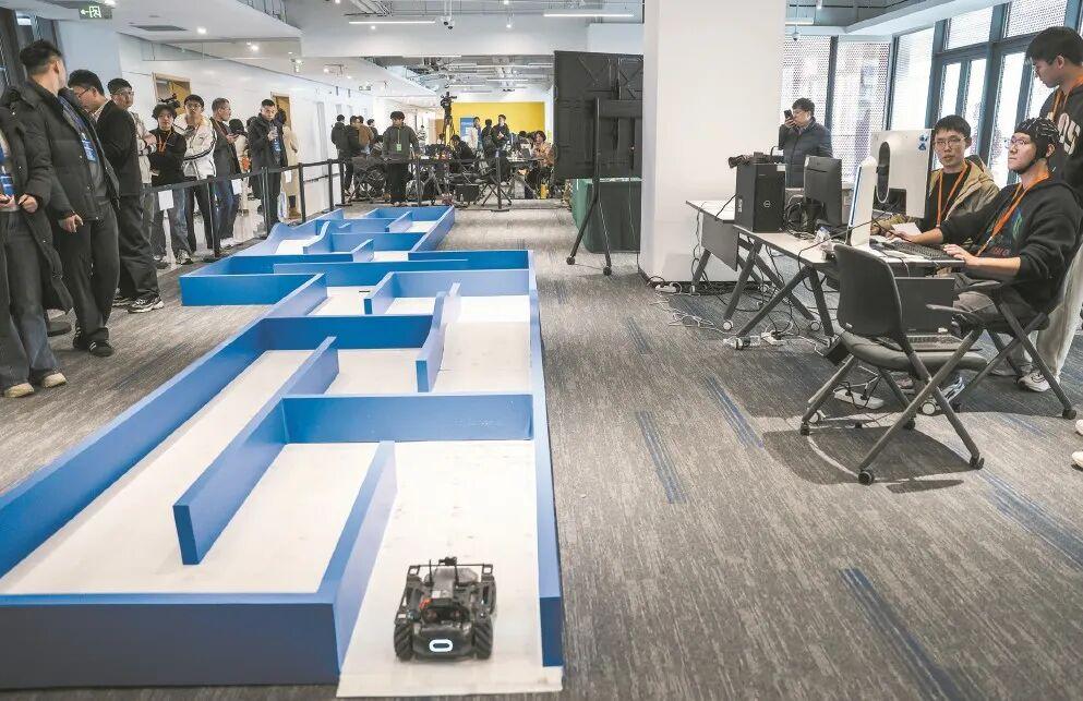 在2025腦機接口大會腦機接口競技賽現場,參賽隊員通過設備控制小車在規定範圍內移動。 本報記者 袁婧攝