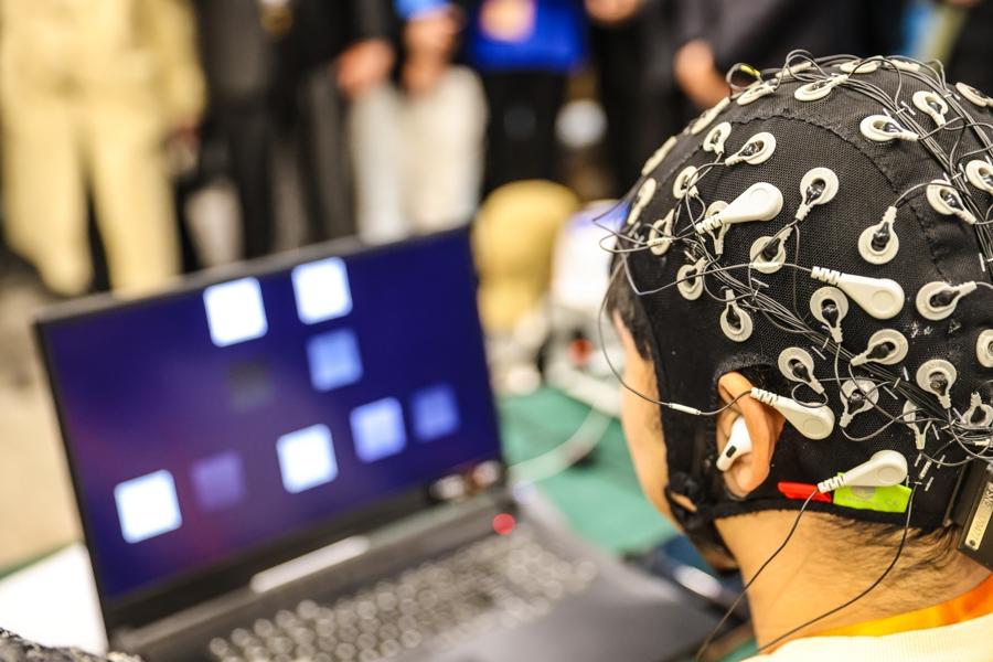 在大會首日另一片區域,國內首次舉辦的大規模、多賽道的腦機接口實戰競賽——腦機接口競技賽同步進行。比賽設置了情緒感知、疲勞監測、腦控機械臂、腦控賽車四大細分賽道,以實時、可視化的方式檢驗腦機接口系統的性能與穩定性。