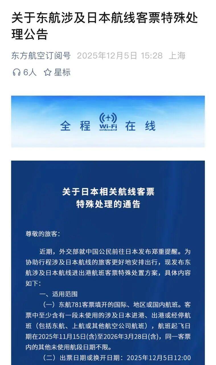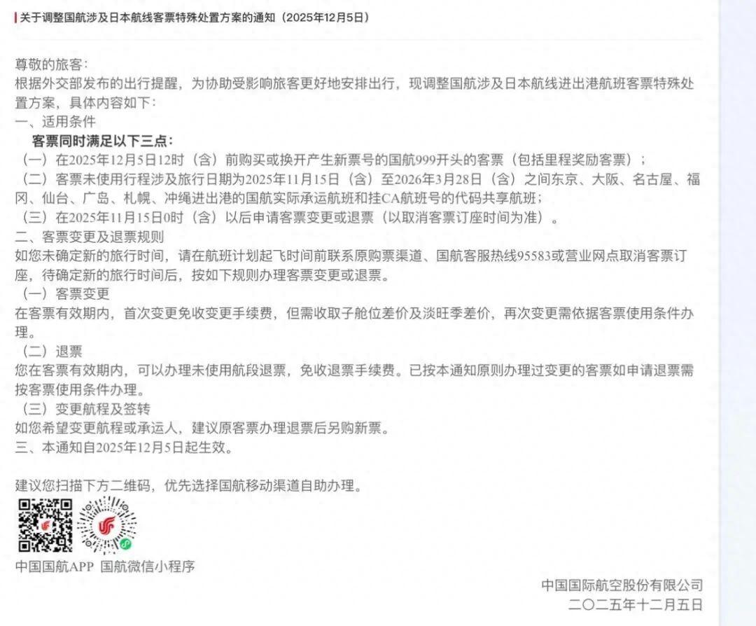 12月5日,國航、東航、南航陸續發佈日本相關航線客票特殊處理的通知,2026年3月28日(含)前出行的涉及日本進港、出港或經停航班可免費退改。在此之前,免費退改簽政策到2025年12月31日結束。