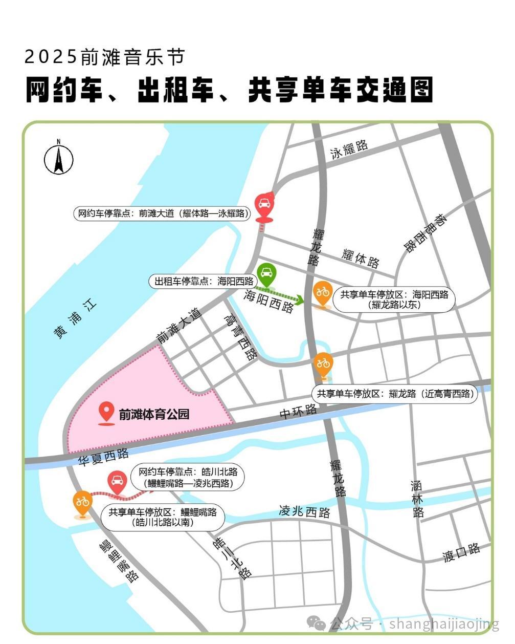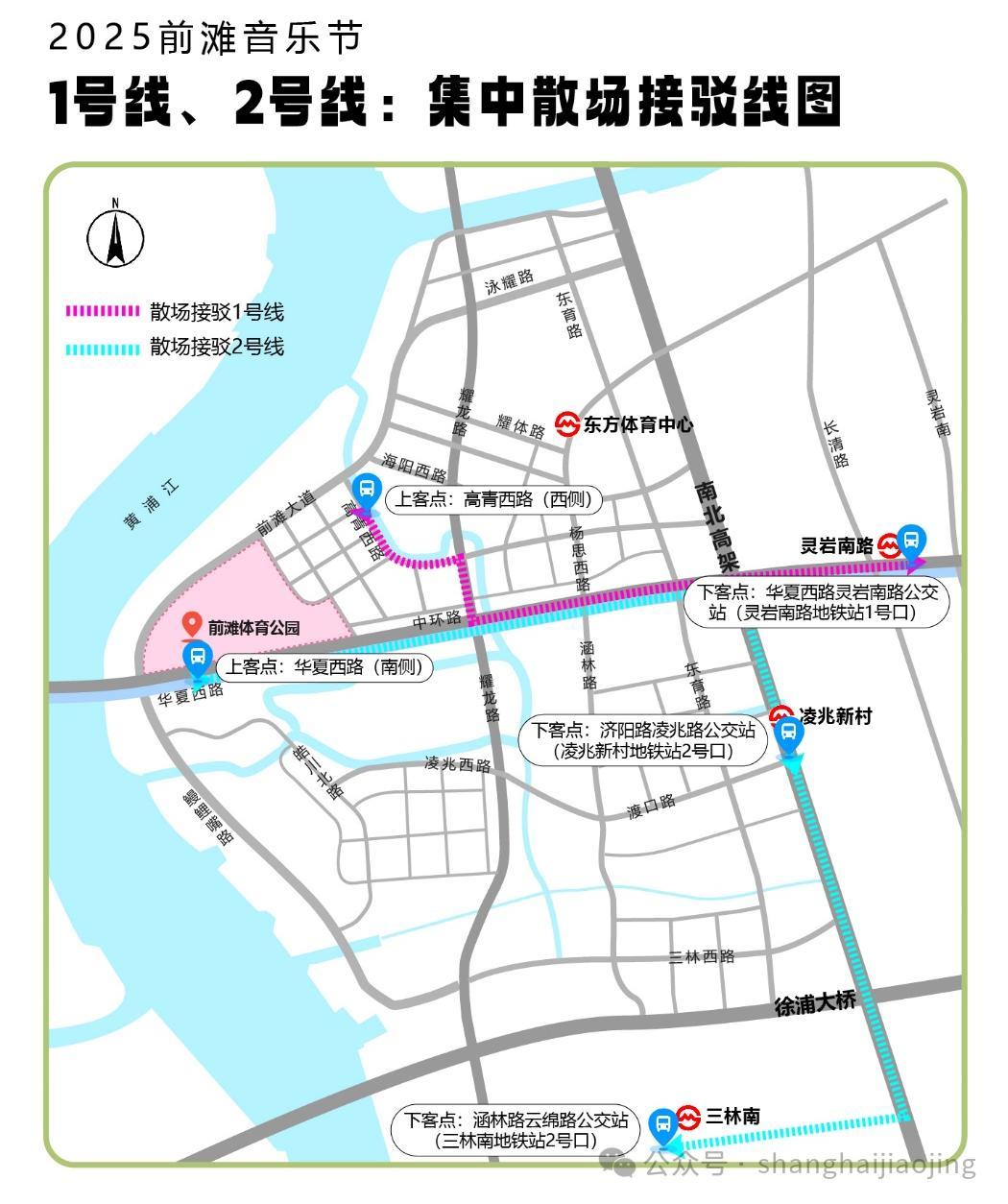 接駁線路:楊思西路耀體路公交站上下客點(東方體育中心地鐵站3號口)—東育路楊思西路公交站上下客點—高青西路上下客點(近梁月路,去往演出場地3/5/6號口)—華夏西路下客點(去往演出場地2/9號口)—華夏西路上客點(南側輔道,公園9號門對面)—楊思西路耀體路公交站下客點(東方體育中心地鐵站3號口),循環接駁