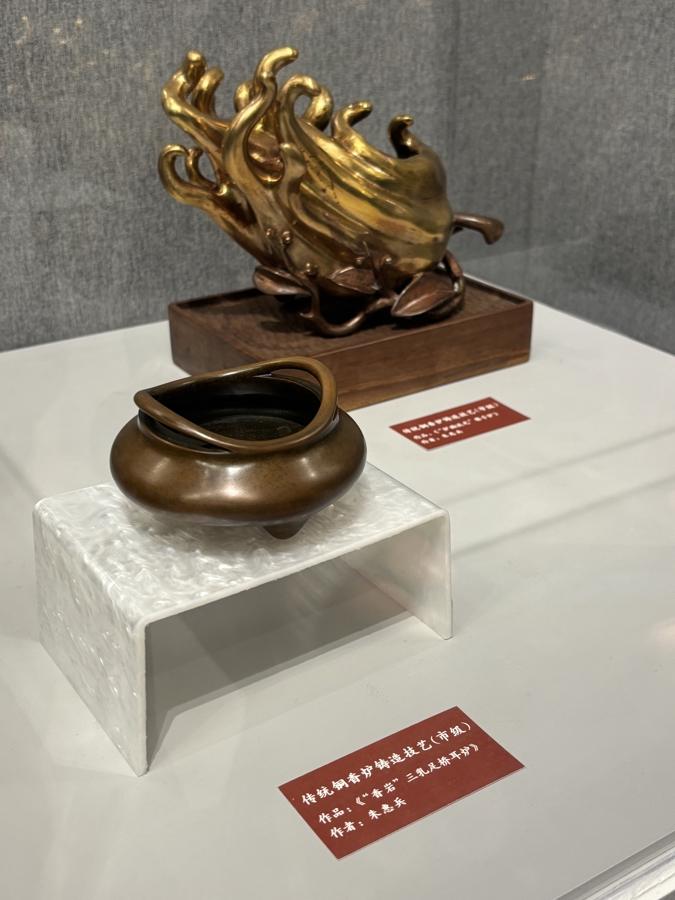 這種古今工藝的呼應,也體現在銅香爐鑄造技藝中。“師傅教導我們不僅要有匠人手藝,還要有文人修養。” 傳承人朱惠兵在創作中,堅持守正創新:“傳統的器型要傳承,但也要研發具有現代審美、能與當代人共鳴的作品。” 例如“佛手爐”,既脫胎於傳統,又融合現代元素。