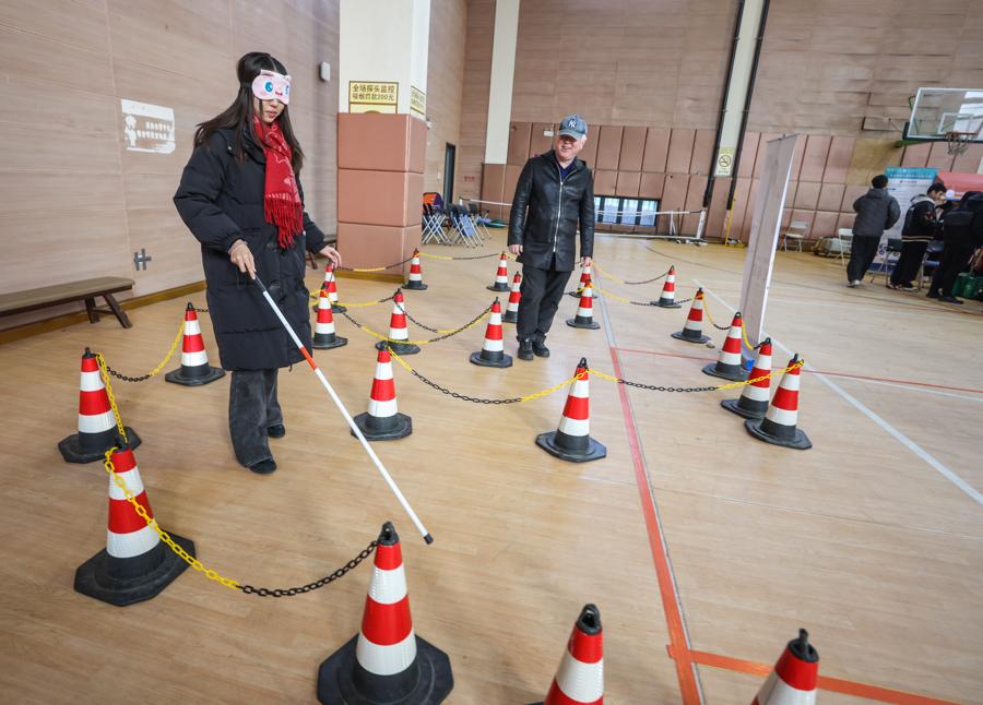 圖爲在“黑暗”公益體驗項目區域,觀衆正在體驗盲人利用盲杖外出行走。