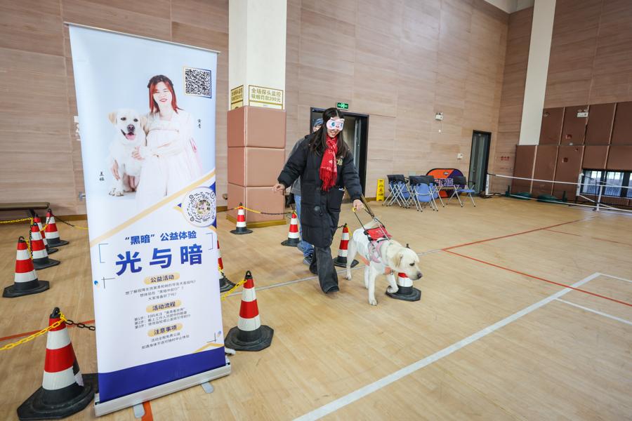 圖爲觀衆在導盲犬幫助下體驗盲人日常外出活動。