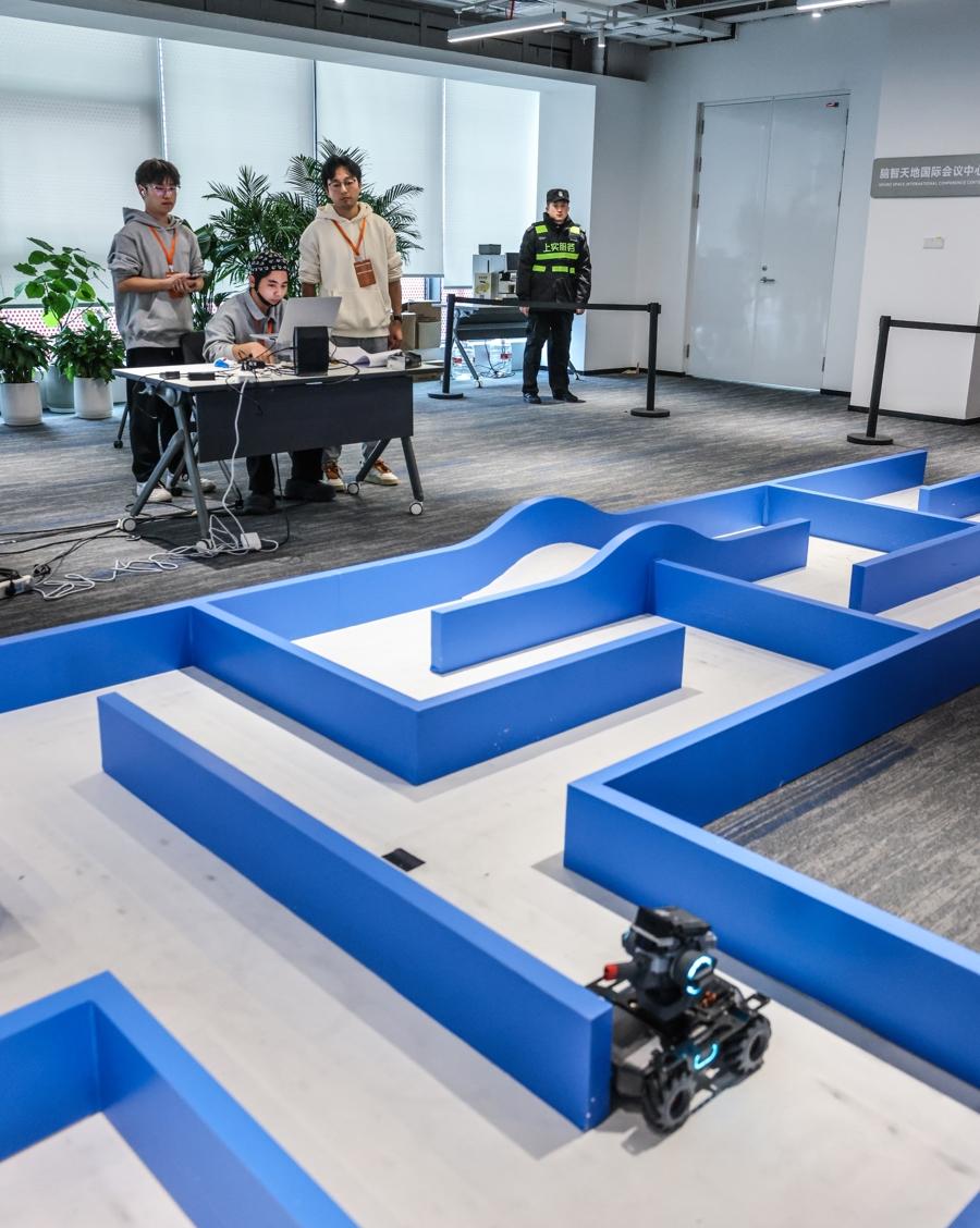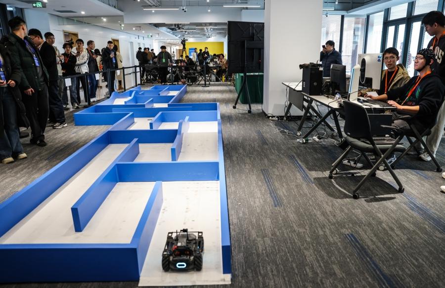 圖爲在腦機接口競技賽——腦控賽車賽道現場,參賽隊員通過腦機接口設備控制小車在規定範圍內移動行駛。