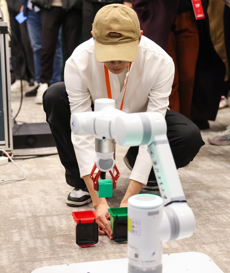 圖爲在腦機接口競技賽——腦控機械臂賽道現場,參賽隊員通過腦機接口設備控制機械臂移動,夾起積木並放入指定點位。