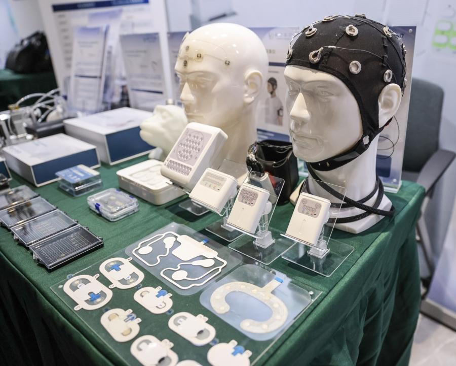 圖爲一家企業在現場展示多款基於腦機接口技術的睡眠健康解決方案。