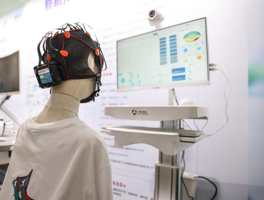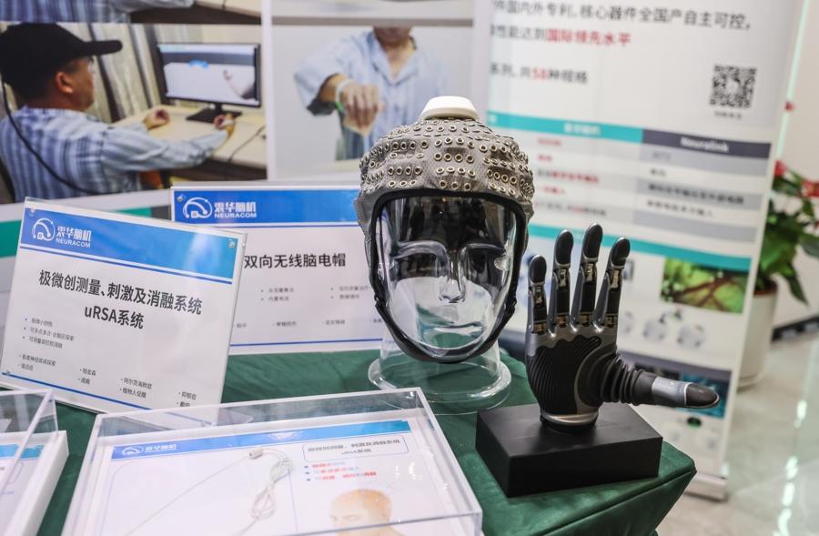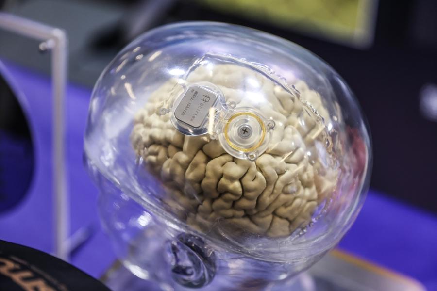 圖爲一家企業在現場展示的雙向植入式腦機接口系統。