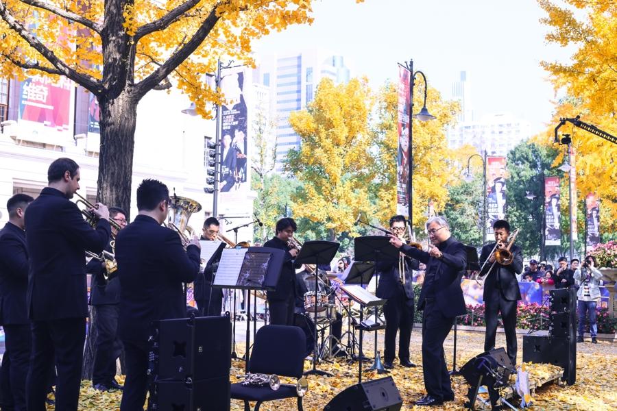 深秋時節,凱迪拉克・上海音樂廳戶外南廣場區域被金黃銀杏葉層層鋪滿。這片已陪伴市民十二載的“最美城市舞臺”,如今依然爲上海的城市文化生活增添着熠熠光彩。作爲2025上海城市草坪音樂會“冬之樂”系列演出之一,今年上海音樂廳的“銀杏音樂會” 由上海銅管室內樂品牌——上海銅管重奏團(Shanghai Brass)的11支銅管與打擊樂共同點亮“杏會金響”。