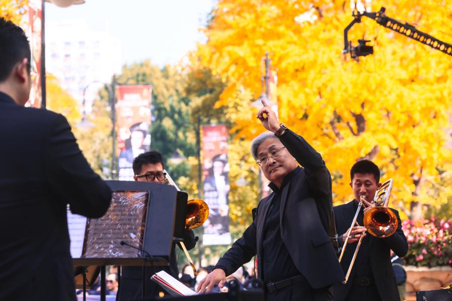 “他們吹得很盡興,希望大家給多點掌聲!好大的肺活量!”12月6日中午,凱迪拉克·上海音樂廳南廣場西側的銀杏林裏,圓號演奏家韓小明與觀衆們的即興互動點燃全場。作爲2025上海城市草坪音樂會“冬之樂”系列演出之一,陪伴滬上市民十二載的上海音樂廳品牌項目銀杏音樂會以“杏會金響”爲主題如期而至。燦爛陽光下,美妙音樂與金黃銀杏彼此映襯,在韓小明的指揮引領下,11位銅管與打擊樂手組成的上海銅管重奏團,獻上一場自然與音樂相融合的戶外演出盛宴。