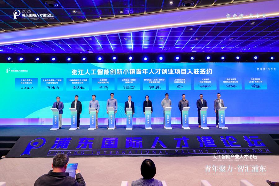 現場還舉行了重點項目入駐簽約儀式。來自雲啓熹光、衆犀成城、數集魔方、拓橋科技、智元曜啓、藍色鯨魚、颶晟科技、芯思諾科技、莊生曉夢科技九家涵蓋AI康復、工業智能體、大模型、神經渲染、腦機接口、端側智能等前沿領域的青年創業企業簽約落戶張江人工智能創新小鎮,展現了浦東對前沿創新項目的強大吸引力與孵化能力。